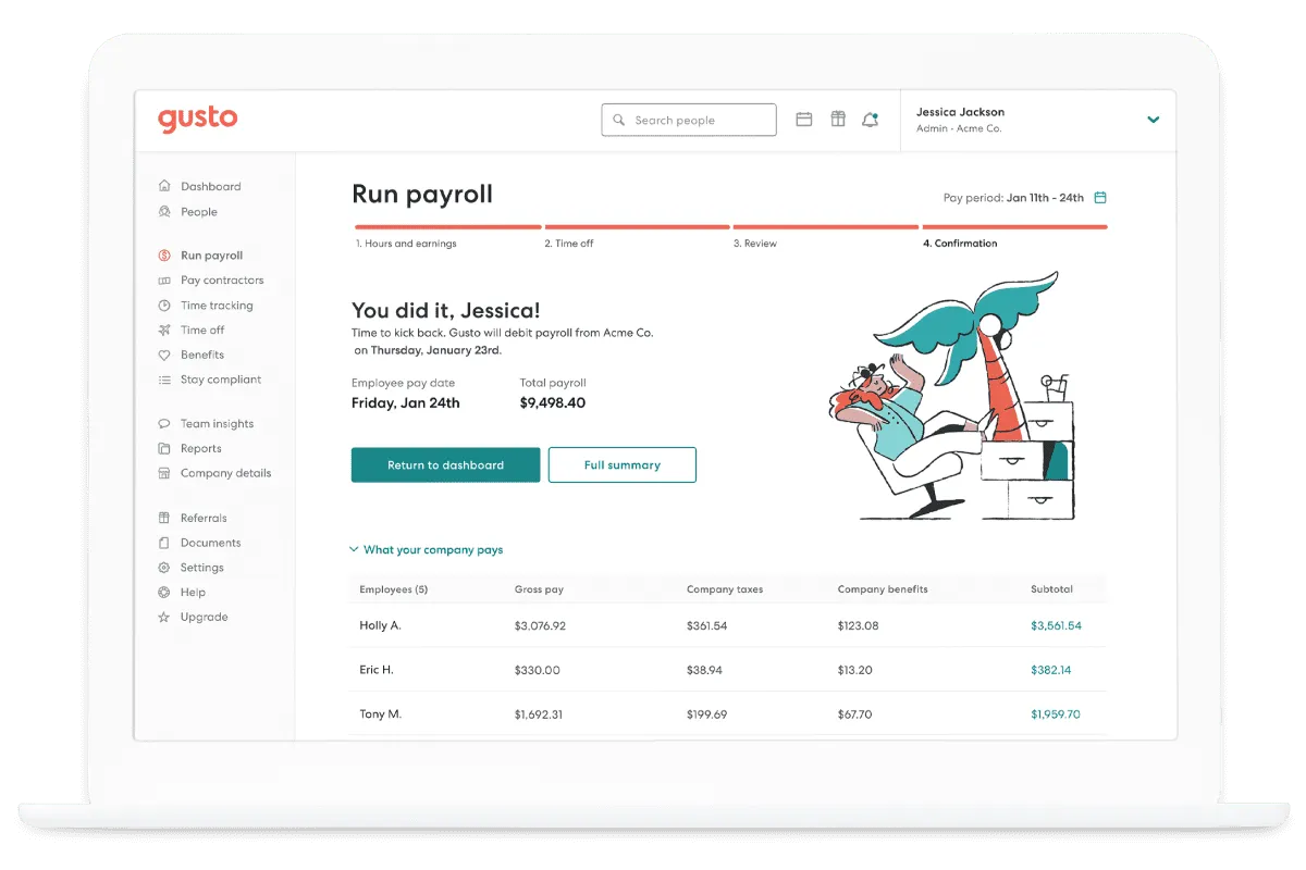 I use Gusto to handle all of my payroll. Paying people via CashApp, Zelle, Venmo, and cash gets confusing fast. Gusto keeps everything in one place for easy tracking and bookkeeping, which makes tax season way less stressful.