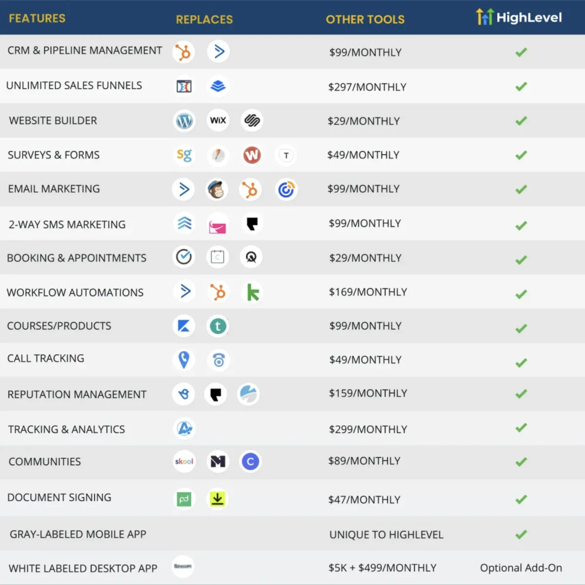 All-in-one business platform for courses (free and paid), community hubs, 2-way communications (SMS, WhatsApp, email), document signing, invoicing, websites, e-commerce, funnels, and much more.